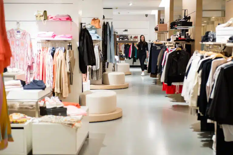 Heller Ladenbereich von Obermaier Moden mit Kleiderstangen, farbiger Kleidung und bequemen Sitzgelegenheiten; im Hintergrund eine Person in schwarzer Kleidung bewegt sich durch den Store, Marken Drykorn und Yaya sichtbar.